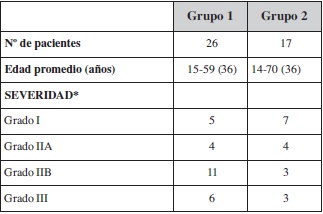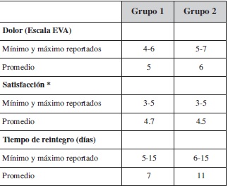 El grupo 1 se reintegro a sus actividades cotidianas en un promedio de 7 días (entre 5 y 8 días) mientras que del grupo 2 lo hizo en un promedio de 11 días (entre 6 y 15 días).