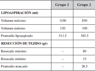 El total de grasa extraída en ambos grupos osciló entre los 100 y 1100 ml de grasa (media de 500 ml para el grupo 1 y de 360 ml para el grupo 2). En el grupo 2 el tejido mamario extraído pesó entre 10 y 45 gr. (media de 16 gr) (Ver Tabla III).
