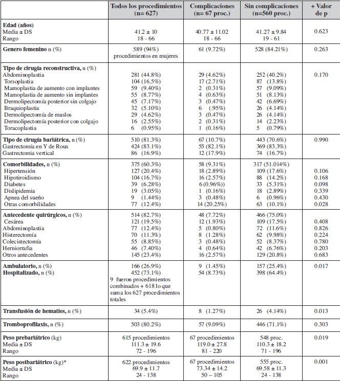 Material y Método: Información retrospectiva y prospectiva de 627 procedimientos quirúrgicos de contorno corporal en 512 pacientes recolectada durante 4 años. Después de un análisis bivariado, seleccionamos las variables con un valor de p ≤ 0.25 para análisis multivariado mediante modelo de regresión logística apropiadamente estimado, probado y ajustado, a fin de identificar las variables independientes que pudieran explicar las complicaciones.