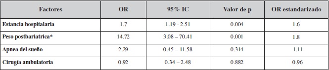 La Tabla III muestra el análisis multivariado de las variables significativas independientes asociadas a las complicaciones: estancia hospitalaria (OR 1.7, IC 95%: 1.17-2.51, p<0.004), y peso postbariátrico (OR 14.72, IC 95%: 3.08-70.41, p<0.001). No hubo casos de embolismo pulmonar, admisión en Unidad de Cuidados Intensivos, ni de muerte.
