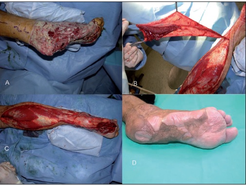 Resultados: No observamos necrosis parcial o total ni otras complicaciones postoperatorias. Todos los colgajos permitieron la reconstrucción de los defectos, sin necesitar otros colgajos complementarios. Los 4 pacientes recuperaron la deambulación.
