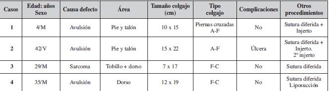 El colgajo de menor extensión era de 7 x 17 cm y el mayor de 15 x 22 cm. El defecto a reconstruir afectaba a la planta en 2 pacientes y al dorso en otros 2. Cubrimos los 2 colgajos adipofasciales con injertos de piel parcial tomada del muslo en la primera intervención (Tabla I).