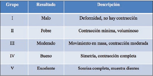 De igual forma, utilizamos la escala de excursión de la sonrisa de Chuang que evalúa el resultado dependiendo de la visibilidad de los dientes durante una sonrisa completa e incluye 5 categorías (Tabla III). Todos nuestros pacientes alcanzaron por lo menos el 2 de calificación, mejorando de una calificación inicial de promedio de 0.25 a una calificación postoperatoria de 2.5 de promedio; logramos hasta el momento las mejores calificaciones en los 2 pacientes en los que utilizamos como nervio donador el espinal accesorio (3 de calificación frente a 2 de calificación en los pacientes en los que usamos la rama maseterina). Ningún paciente presentó sincinesias ni contracturas (Tabla VII).