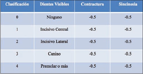 Escala de excursión de la sonrisa de Chuang (Tabla III).