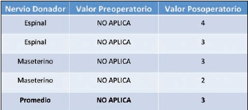 En la serie de 4 pacientes que presentamos utilizamos la rama maseterina como nervio donador en 2 de ellos, y en el resto el nervio espinal accesorio; esto se debió a que en a la exploración física inicial apreciamos una disminución en la fuerza de la mordida y posteriormente la electromiografía preoperatoria confirmó una disminución en la actividad motora del masetero. Hasta el momento, con estos nervios donadores, hemos logrado una contracción completa en todos los casos. Sin embargo, en aquellos casos en los que utilizamos el nervio espinal notamos mejores calificaciones en las escalas utilizadas para evaluación de resultados; pero cabe señalar que estos casos también coinciden con los de mayor tiempo de postoperatorio, por lo que habrá que continuar con el seguimiento para poder comparar ambos grupos.