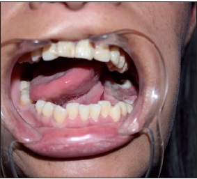 En el examen físico observamos asimetría facial del tercio inferior izquierdo con aumento de volumen en la región submandibular (Fig. 1). En el examen intra-oral apreciamos una lesión ubicada en el reborde alveolar mandibular y piso de boca del lado izquierdo, de consistencia indurada, coloración blanquecina y rojiza, con bordes irregulares, dolorosa, no móvil, con desplazamiento de piezas dentarias y expansión de corticales (Fig. 2).