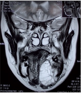 La tomografía computarizada (TC) de macizo facial sin contraste muestra la presencia de una masa tumoral heterogénea con densidad central necrótica y periferia sólida, que infiltra los músculos geniohioideo, milohioideo y geniogloso, desplazando estructuras hacia el lado derecho. Además encontramos infiltración irregular en la cortical ósea de la rama mandibular izquierda. En la resonancia magnética (RM) evidenciamos la presencia de una lesión ocupativa hiperintensa redondeada, de bordes irregulares, con contenido heterogéneo, de aproximadamente 9 x 8 x 9 cm, que desplaza las estructuras del piso de boca del lado izquierdo y de la vía aérea con efecto de masa (Fig. 3).