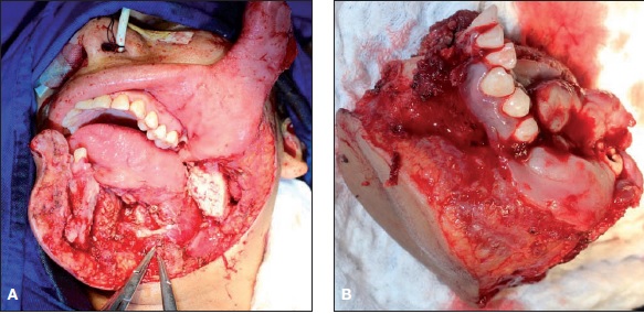 La resección oncológica consistió en una hemimandibulectomía del lado izquierdo, resección del piso de boca y disección cervical radical modificada tipo III del mismo lado, dejando un defecto amplio con dimensiones de 9.5 cm de longitud en sentido anteroposterior, 8 cm de altura y 6 cm de profundidad, de tejidos blandos y hueso (Fig. 4A).