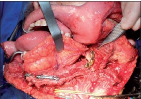 Es interesante destacar en nuestra presentación que la cirugía fue llevada a cabo por un grupo multidisciplinario formado por Cirugía Plástica y Reconstructiva, Cirugía Maxilofacial y Cirugía Oncológica. Antes de la cirugía se reunió un comité de tumores con las especialidades quirúrgicas mencionadas y las especialidades clínicas de Anestesiología, Oncología y Medicina Interna. Una vez determinado que la necesidad de resección quirúrgica incluía tejidos blandos de la cubierta facial submandibular izquierda y la resección de piso de boca y mandíbula, se decidió realizar una reconstrucción con doble colgajo libre, lo cual llevó a formar equipos que trabajaran de forma simultánea. Asi, mientras Cirugía Oncológica realizaba la resección de la lesión, Cirugía Plástica realizó el levantamiento del colgajo osteocutáneo de peroné; una vez que el colgajo estuvo levantado, Cirugía Maxilofacial realizó las osteotomías en el colgajo de peroné de acuerdo a las medidas del defecto creado en la mandíbula y Cirugía Plástica empezó el levantamiento del colgajo antebraquial radial. Terminada la resección de tumor, Cirugía Plástica en conjunto con Cirugía Maxilofacial trasportaron el colgajo osteocutáneo de peroné al cuello, realizaron la adaptación de los segmentos óseos con material de osteosíntesis, la adaptación de los tejidos blandos para recubrimiento interno y las anastomosis microquirúrgicas. Posteriormente, Cirugía Plástica terminó el levantamiento del colgajo antebraquial radial y en conjunto con Cirugía Maxilofacial realizaron el recubrimiento externo y las anastomosis microquirúrgicas del segundo colgajo.