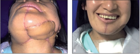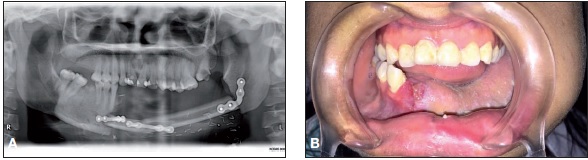 Realizamos una radiografía postoperatoria de control 30 días después del procedimiento quirúrgico, comprobando la reconstrucción mandibular (Fig. 6A). Tras 6 meses de evolución la fonación era normal, la paciente masticaba alimentos sólidos con normalidad por el lado no afectado y no hubo fístulas ni exposición de hueso o del material de osteosíntesis. La oclusión se desplazó aproximadamente 2 mm hacia el lado derecho, considerando la falta de musculatura del lado afectado (Fig. 6B).