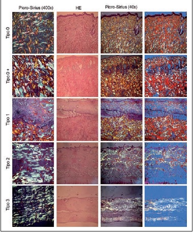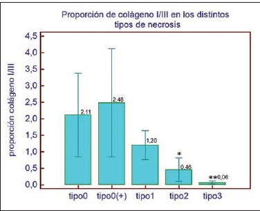 Al realizar el análisis de la proporcionalidad de los colágenos I y III, observamos en condiciones normales y en el colgajo con cambios atróficos sin necrosis, un aumento en la proporcionalidad del colágeno I. También una disminución del colágeno I a expensas de un aumento del colágeno III a medida que progresa la necrosis, siendo estadísticamente significativo en los tipos 2 y 3 respecto al tipo 0 (Fig. 10).