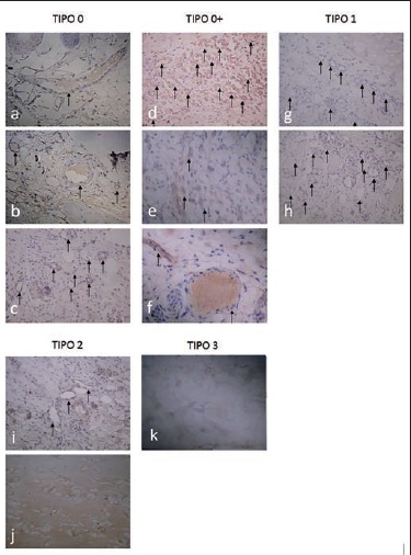 Durante el desarrollo del trabajo, al séptimo día de postoperatorio observamos grados variables de necrosis en el colgajo cutáneo aleatorio en los distintos grupos. Clasificamos esos grados de necrosis tomando en cuenta características al examen físico como la coloración y textura y correlacionamos con los cambios histopatológicos. De esta forma clasificamos distintos grados de necrosis que especificamos en la Tabla I. De esta forma, consideramos el tipo 0 como piel normal, mientras que el tipo 3 correspondió a la necrosis en su grado máximo. El examen físico de la piel sana mantiene la coloración y textura elástica y blanda. A medida que va progresando la necrosis, comienza a cambiar hacia un tono más oscuro a la vez que la textura y consistencia van aumentando hasta tornarse acartonada y delgada. Correlacionamos esto directamente con un adelgazamiento progresivo de la dermis, atrofia del epitelio asociada a focos de desprendimiento, atrofia y necrosis de los anexos cutáneos, presencia de células fantasmas (células sin su núcleo), homogenización e hipereosinofilia del tejido conectivo,(15) presencia de infiltrado inflamatorio superficial y profundo y disminución del número de vasos sanguíneos (Fig. 5). De esta manera, aparte de realizar la medición correspondiente al área de necrosis, le otorgamos una puntuación del 0 al 3 (tipo 0=0 / tipo 0+=0 / tipo 1=1 / tipo 2=2 y tipo 3=3) para analizar de mejor forma los cambios isquémicos/necróticos mediante tinción de HE y Tricrómico de Masson (Fig. 6-8) y análisis de la proporcionalidad de colágeno tipo I y III mediante el programa Image-Pro Plus 6 (Fig, 9 y 10). Por último, realizamos la tinción de VEGF para evaluar la presencia de vasos de neoformación (Fig. 11).