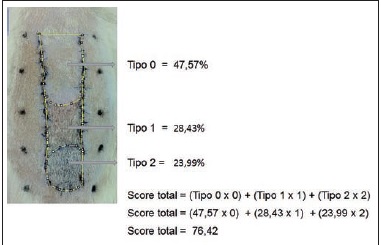 Tomando en cuenta la puntuación descrita en la clasificación de necrosis, el área de necrosis obtenida se multiplicó según el tipo de necrosis. En la Fig. 12 ilustramos cómo obtuvimos la puntuación total tomando en cuenta características macroscópicas mediante inspección y palpación que corroboramos con el análisis histopatológico.