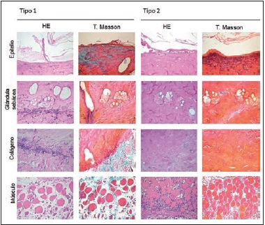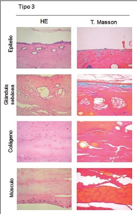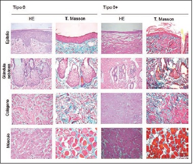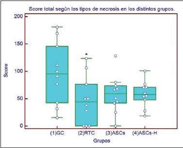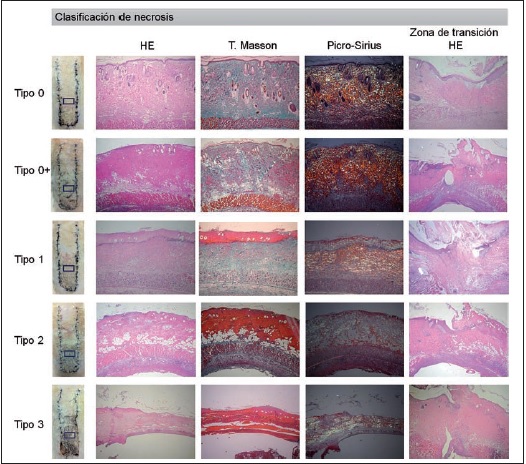 Resultados: Según la clasificación, el tipo 0 fue considerado como piel normal; tipo 0+ con cambio adaptativo reversible; tipo 1 necrosis menor con inflamación superficial; tipo 2 necrosis menor con inflamación profunda; y finalmente el tipo 3 necrosis en su grado máximo. La piel sana mantiene la coloración y textura elástica y blanda. A medida que progresa la necrosis cambia hacia un tono más oscuro, y la textura y consistencia van aumentando hasta tornarse acartonada y delgada. En los tipos 0+ y 1 observamos focos de reepitelización temprana al séptimo día, mientras que en estadios más avanzados la necrosis fue completa. El grupo de RTC presenta una menor puntuación y por lo tanto necrosis de menor grado respecto al resto de los grupos tratados. Por otra parte, el porcentaje global de necrosis fue menor en los grupos tratados con ASCs y ASCs-H respecto al grupo control (p ≤ 0.05)