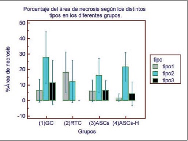 Por otra parte, en ambos grupos tratados con células madre no hubo diferencias de proporcionalidad de los tipos de necrosis respecto al control, presentando mayor proporción de necrosis tipo 2 seguida de necrosis tipo 3, contrario a lo encontrado en el grupo de retardo de colgajo con un aumento significativo de necrosis tipo 1 y con ausencia de necrosis tipo 3.
