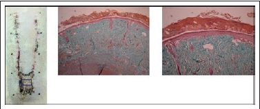 Obtuvimos secciones de tejido de 4 zonas de proximal a distal, a 1, 3, 5 y 7 cm aproximadamente desde la base del colgajo, y categorizados en zonas 1, 2, 3 y 4 respectivamente (Fig. 3). Se fijaron en Duboscq Brasil durante 6 horas y luego se mantuvieron en alcohol de 70°. Posteriormente fueron embebidas en parafina y cortadas transversalmente con micrótomo. Realizamos tinciones de hematoxilina/eosina (HE), Tricrómico de Masson y Picro-Sirius para la observación de colágeno tipo I y III con luz polarizada y análisis computacional con el programa Image-Pro® Plus Version 6.0 para evaluación de la proporcionalidad de colágeno I/III. Con la tinción Picro-Sirius con luz polarizada, las fibras de colágeno gruesas y organizadas presentan birrefringencia intensa en color rojo correspondiente al colágeno tipo I, mientras que en verde claro se observa el colágeno tipo III con birrefringencia más débil.(13,14) (Fig. 4). Para el estudio cualitativo de células endoteliales y revascularización realizamos tinción inmunohistoquímica con anti-VEGF (factor de crecimiento endotelial vascular) 1:500 (Santa Cruz Biotechnology®, Santa Cruz, CA).