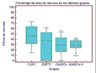 Results: According to the classification of necrosis, type 0 was considered normal skin; type 0+ with reversible adaptive change; type 1 minor necrosis with superficial inflammation; type 2 minor necrosis with deep inflammation; and finally type 3 necrosis in its maximum degree. Healthy skin maintains coloring, elastic and soft texture. As necrosis progresses shifts towards a darker tone, texture and consistency increases until it becomes stiff and thin. In types 0+ and 1, foci of early re-epithelialization was observed on the seventh day, while more advanced in the classification stages, necrosis is complete. The group of RTC presents a lower score and therefore lesser degree of necrosis with respect to the rest of the treated groups. Moreover the overall percentage of necrosis was lower in the groups treated with ASCs and ASCs-H in the control group (p ≤ 0.05)