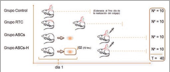 Empleamos 40 ratas Sprague-Dawley machos, de peso entre 300-500 gr. intervenidas bajo las normas bioéticas del ICBM (Instituto de Ciencias Biomédicas) para la experimentación con animales de laboratorio. Las ratas fueron anestesiadas con ketamina 80 mg/kg y xilacina 8 mg/kg vía intramuscular. Preoperatoriamente se les administró penicilina benzatina 40.000 U/Kg intramuscular. Tras la anestesia los animales fueron intervenidos según el grupo perteneciente, aleatorizadas en 4 grupos: grupo control (n=10); grupo intervenido mediante retardo del colgajo (RTC) (n=10); grupo intervenido con células madre derivadas de tejido adiposo adultas (ASCs) (n=10); y grupo intervenido con células madre derivadas de tejido adiposo adultas precondicionadas con hipoxia (ASCs-H) (n=10) (Fig. 1).