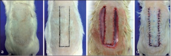 Rasuramos la región dorsal. En condiciones de asepsia y antisepsia, colocamos los animales en posición de decúbito ventral y dibujamos un rectángulo cuyo margen craneal está a nivel de la cintura escapular y el caudal a nivel de la cintura pélvica. Realizamos la incisión del colgajo con bisturí nº 23. Elevamos el colgajo con una anchura de 2 cm conservando su pedículo craneal y una longitud de 8 cm, de grosor que involucre piel y tejido celular subcutáneo. Luego colocamos en el lecho una lámina de silicona (Parafilm M®) previamente sumergida en alcohol de 70° y luego sometida a luz ultravioleta durante 15 minutos, de 1 mm de grosor, con una anchura y longitud que cubra totalmente el lecho; la fijamos utilizando sutura de catgut 4-0 en sus 4 esquinas. Posteriormente, reposicionamos el colgajo suturándolo cuidadosamente con nylon 4-0 (Fig. 2).