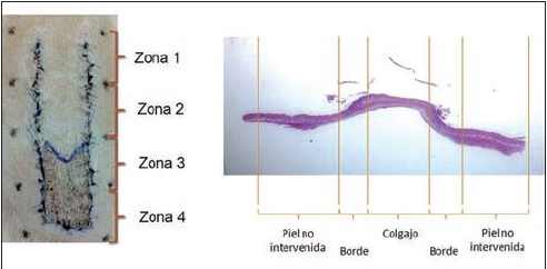 A la semana de la intervención quirúrgica llevamos a cabo la eutanasia de los animales con solución de eutanasia 0.1 ml administrada a nivel intratorácico. Tomamos imágenes digitales del colgajo a una distancia estandarizada para su posterior análisis en computadora mediante el programa ImageJ 1.45s. Categorizamos las zonas en áreas necróticas y área total, manteniendo como bordes los límites del colgajo. Expresamos los resultados en áreas de necrosis en relación al área total del colgajo. Además, identificamos distintos grados de necrosis en el colgajo cutáneo aleatorio al séptimo día de postoperatorio tomando en cuenta características al examen físico y cambios histopatológicos. Realizamos una clasificación de necrosis otorgando una puntuación del 0 al 3 desde piel sana hasta colgajo con necrosis de mayor grado. Por último, obtuvimos una puntuación de necrosis multiplicando el área de necrosis y la puntuación según la clasificación.