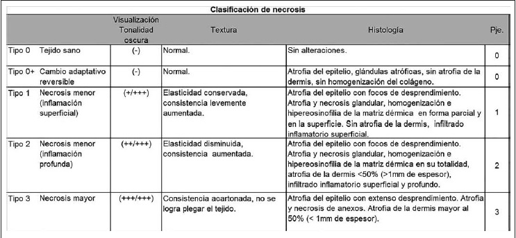 Esta clasificación parece ser un método adecuado para entender la evolución de la necrosis del colgajo cutáneo y como método complementario para analizar la efectividad de distintos tratamientos, ya que considera los aspectos histopatológicos además del área de necrosis en forma global.