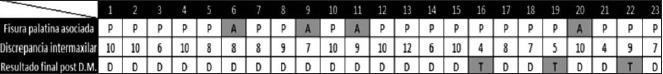 La media de la discrepancia máxilo-mandibular fue de 8 mm (mínima de 4 mm y máxima de 12 mm). La media en pacientes sin fisura de paladar asociada fue de 8.6 mm en comparación con 7.8 mm en pacientes con fisura palatina asociada.