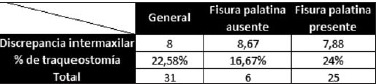 Del grupo de pacientes con discrepancia máxilo-mandibular mayor o igual a 7 mm (n=24), el 75% (n=18) presentaba fisura palatina asociada y el 25% (n=6) no, y encontramos fracaso del tratamiento en el 11.1% (n=2) y en el 16.6% (n=1) de cada grupo respectivo de pacientes.