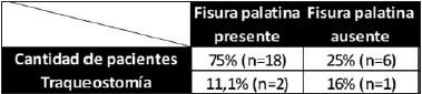 Esta diferencia resultó ser estadísticamente significativa a la luz del test binomial (p= 0.01), e indica la posibilidad de que los pacientes con secuencia de Pierre Robin que no presentan fisura de paladar y que además tienen una discrepancia máxilo-mandibular superior o igual a 7 mm finalicen con una traqueostomía (Tabla III).