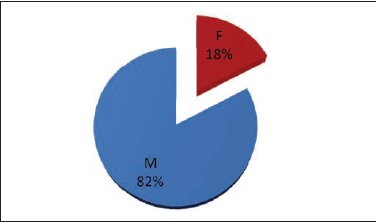 La muestra final fue de 214 pacientes, con predominio de sexo masculino, 177 (82%) y 37 mujeres (17.9%); proporción de 4.5:1 (Gráfico 1) (Fig. 1).