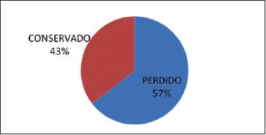 De los 133 pacientes que presentaron lesión del cartílago, en 76 (57.1%) hubo pérdida de cartílago en diferentes proporciones; y en 57 pacientes, a pesar de presentar lesión del cartílago, no hubo pérdida del mismo (42.8%) (Gráfico 4).