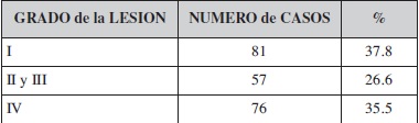 Dentro de la clasificación de Weerda, 81 pacientes (37.8%) presentaban lesión de grado I sin laceración del cartílago; 57 pacientes (26.6%) de grado II y grado III; y finalmente 76 pacientes (35.5%) de grado IV, es decir, con pérdida de un segmento o amputación total; esta última se presentó sólo en 7 casos (Tabla I).