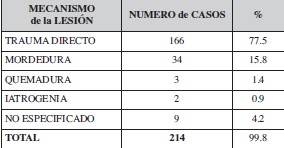 El mecanismo de lesión más frecuente fue el traumatismo directo (77.5%, n=166 pacientes). Dentro de este subgrupo, el 15% fueron por caída (n=25); 22.8% por accidente en vehículo motorizado (motocicleta o automóvil) (n=38); y en el 62% (n=103) secundario a agresión por terceras personas.; 34 casos por mordedura (15.8%) de los cuales 24 fueron por humano, 9 por perro y 1 por caballo; 3 por quemaduras (1.4%); 2 lesiones iatrogénicas (0.9%) que fueron 1 por episiotomía en recién nacido y otra con ampollas y epidermólisis por presión en paciente intubado de 4 años de edad; hubo 9 lesiones no especificadas (4.2%).