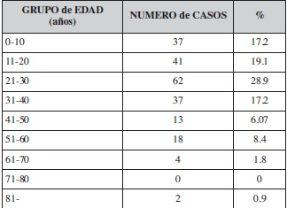 En relación a la edad de los pacientes afectados encontramos que la más frecuente fue de 33 años (n=12 pacientes), con rango desde el nacimiento hasta los 81 años. Vimos una tendencia en adultos jóvenes para la presentación de estas lesiones, con un grupo de edad comprendido entre los 0 y 40 años en el que se dio el 82% de los casos (n=177 pacientes), con una media de 26 años (Tabla III).