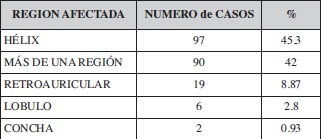 En cuanto a las regiones anatómicas afectadas encontramos 97 casos en hélix (4.3%); 90 casos con más de una región afectada (42%); en 19 casos la lesión fue retroauricular (8.87%); en 6 casos afectó solo al lóbulo (2.8%); y en 2 casos a la concha auricular (0.93%) (Tabla IV).