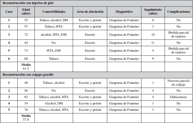 Llevamos a cabo un estudio descriptivo incluyendo todos los pacientes con diagnóstico de defecto de cobertura escrotal mayor del 50% y de espesor total intervenidos por el Servicio de Cirugía Plástica del Hospital Universitario La Fe de Valencia, España, desde enero de 2006 hasta marzo de 2016. Contabilizamos 19 pacientes sometidos a reconstrucción de defecto escrotal mediante cobertura con autoinjerto o colgajo de gracilis pediculado. En el momento del estudio, 4 de los pacientes habían fallecido y pudimos obtener información únicamente de otros 11.