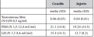 La producción testicular de testosterona está regulada mediante mecanismos de retroalimentación del eje hipotálamo-hipófisis-gonadal, por los que la disminución en su producción incrementa los valores de FSH y LH hipofisarias. Este hecho está presente en el proceso de envejecimiento natural(6) y lo observamos en los 2 grupos de pacientes de nuestro estudio (en el grupo de gracilis obtuvimos valores de testosterona libre de 0.06 ng/ml, FSH de 21.1 mU/ml, LH de 15.4 mU/ml; y en el grupo de injerto de piel parcial 0.04ng/ml, 19.24 mU/ml y 12.7 mU/ml respectivamente), no apreciando diferencias sustanciales entre ellos tras la reconstrucción.