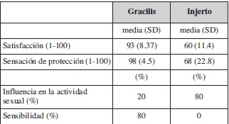 Las opiniones en cuanto al resultado cosmético obtenido tras la reconstrucción con injerto de piel frente a colgajo son contradictorias. Algunos autores consideran que el resultado obtenido mediante cualquier tipo de es sub-óptimo en comparación con el injerto, debido al mayor grosor tisular que aporta..(10,17) No obstante, la mayoría apoyan la elección de la cobertura mediante colgajos fasciocutáneos, miocutáneos o musculares y consideran aceptable el resultado obtenido.(3,4,14,18-20) En nuestro estudio, los datos avalan esta última opinión, presentando un mayor grado de satisfacción y sensación de protección el grupo de pacientes reconstruidos mediante colgajo muscular de gracilis, además de una actividad sexual normal, apenas influenciada tras este tipo de reconstrucción en comparación con el grupo tratado mediante injertos de piel parcial.