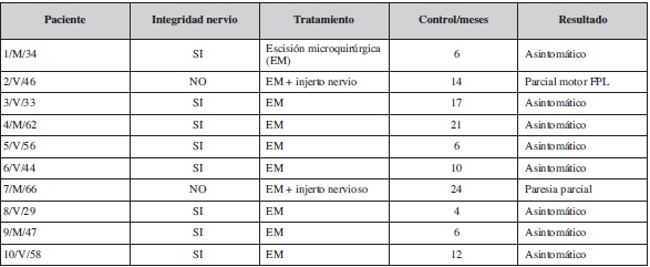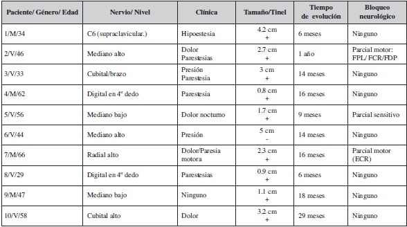 Resultados: El 60% de la muestra fueron varones, con edad media de 47.5 años. El nervio mediano fue el más frecuentemente afectado. El dolor local y las parestesias los síntomas más frecuentes, con Tinel positivo en el 90% de los casos. El 30% de los pacientes presentó bloqueo nervioso (motor/sensitivo) en la electrofisiología y 2 casos discontinuidad del nervio. La escisión microquirúrgica bajo magnificación óptica fue el tratamiento de elección en el 80% de los casos; 20% necesitaron injerto de nervio sural para la reparación del nervio afectado. Con un seguimiento medio de 12 meses, el 80% de los casos no presentó secuelas tras el tratamiento.