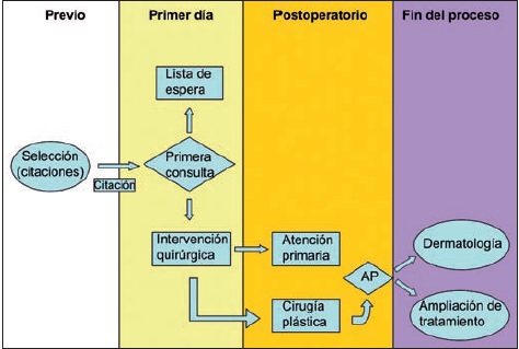 En definitiva, el paciente ya diagnosticado y evaluado por Dermatología vuelve a ser valorado por Cirugía Plástica como primer día e intervenido en una segunda visita; es controlado en el postoperatorio por su médico de primaria y por el cirujano plástico; y finalmente vuelve a acudir a la consulta para ser informado del resultado anatomopatológico de la lesión y remitido para control posterior a su dermatólogo. Visto desde esta perspectiva, es obvio pensar que algo falla en el sistema ya que el paciente al final debe recorrer innumerables consultas, muchas duplicadas, durante varios días, simplemente para solucionar un proceso de cirugía menor.