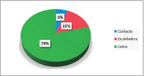 Un total de 33 pacientes con quemaduras circulares profundas en las extremidades fueron atendidos en la Unidad de Quemados de nuestro hospital entre enero de 2014 y enero de 2017. En cuanto a la distribución por género, 6 fueron mujeres y 27 varones, con edades comprendidas entre los 18 y los 83 años (media de 48 años). El mecanismo lesional más frecuente fue la llama (79%, n=26), seguido de escaldadura (15%, n=5) y contacto (6%, n=2) ( Gráfico 1 ). En cuanto a su localización, el 51.5% (n=17) de los pacientes presentaron quemadura circular con afectación de miembro superior, el 42% (n= 14) del miembro inferior, y el 6% (n=2) de ambos.