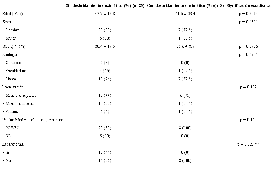 Resultados: Evaluamos los registros de 33 pacientes, de los que 25 recibieron tratamiento tradicional sin aplicación de desbridante enzimático y 8 fueron tratados con desbridamiento enzimático. En el primer grupo se realizaron 11 escarotomías (44%), mientras que en el segundo no se realizó ninguna. Estas diferencias fueron estadísticamente significativas (p<0.05).