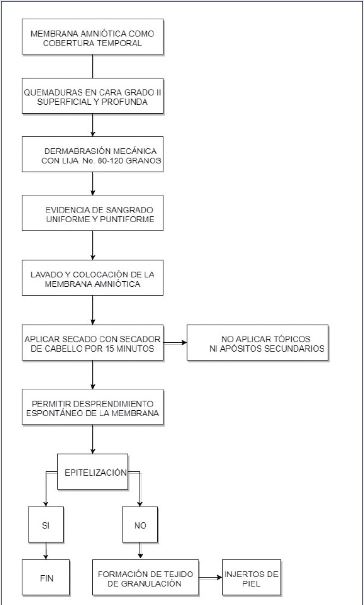Establecimos un algoritmo para la aplicación del amnion en las quemaduras faciales que presentamos en la figura 1 . Después de firmar el consentimiento informado, el paciente es llevado a cirugía y bajo anestesia general se lavan las áreas quemadas con solución salina normal y jabón de clorhexidina. Posteriormente, se realiza la dermoabrasión mecánica en la cara con papel de lija de 100-120 gr. hasta obtener un sangrado puntiforme y uniforme como evidencia de la presencia de tejido viable. Se retira la membrana amniótica de su empaque y se lava 3 veces con solución salina empleando 10 minutos por cada lavado y a temperatura ambiente, hasta eliminar totalmente el glicerol y rehidratarla adecuadamente. Después de separar el amnion de su porción coriónica, se aplica la membrana amniótica en la cara, sobre las áreas sangrantes, facilitando su adherencia mediante el uso de un secador de cabello a temperatura media durante 15 minutos. No aplicamos ningún otro tipo de agente tópico o apósito secundario.