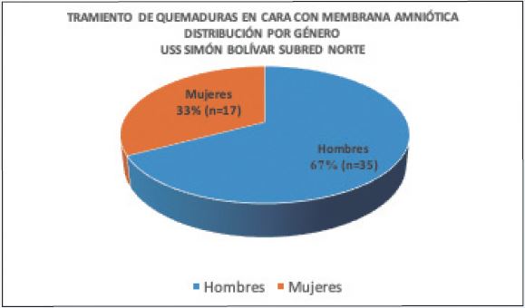 La muestra de pacientes contó con más hombres (67.3%, n=35) que mujeres (32.7%, n=17) ( Gráfico 1 ), en una proporción de 2:1. De los 52 pacientes, 46 presentaron quemaduras mixtas, de espesor parcial superficial y profundo. Seis de los 52 pacientes presentaron, además de sus quemaduras de espesor parcial superficial y profundo, pequeñas áreas de quemaduras de espesor total. Los agentes causantes fueron fuego (61.5%, n=32), sustancias químicas (11.5%, n=6), explosión en mina de carbón (1.9%, n=1), necrosis epidérmica tóxica (1.9%, n=1), pólvora (3.8%, n=2), electricidad (5.8%, n=3), aceite caliente (3.8%, n=2), y líquidos hirvientes (9.6%, n=5).
