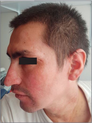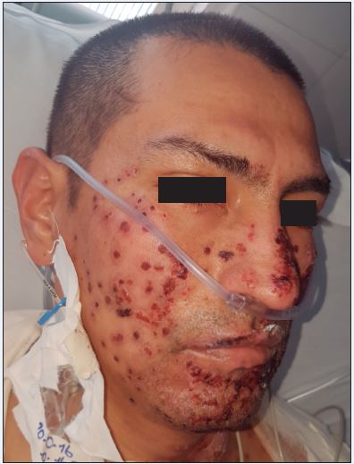Todos los pacientes refirieron una disminución a cero según escala EVA en términos de dolor después de la aplicación de la membrana amniótica y durante el proceso de epitelización. Solo 1 paciente, que tenía antecedentes de 3 episodios de herpes oral previos a la quemadura, desarrolló herpes simple que fue controlado con Aciclovir ( Fig. 5 ), seguramente por reactivación del virus al estar sometido a una condición de inmunodeficiencia por la quemadura y el trauma quirúrgico de la dermoabrasión.( 19 ) Una vez que diagnosticamos este episodio de herpes simple, dimos aviso al banco de piel. De acuerdo a sus protocolos, de cada membrana procesada se guarda una muestra para realizar nuevos estudios en busca de algún tipo de contaminación en el caso de que se reporte alguna infección en los pacientes tratados, con el fin de determinar si la fuente de infección provino de la membrana amniótica. En este caso, las muestras fueron negativas. Al paciente también se le había aplicado amnion en el dorso de las manos sin que en estas zonas se hubiera producido infección. Adicionalmente, en la Unidad de Quemados se hicieron cultivos de la nevera donde se almacena la membrana amniótica antes de su utilización, y de los elementos de la sala de cirugía, que también fueron informados como negativos, demostrando así que no hubo ninguna relación entre el caso de herpes simple y la posibilidad de contaminación por la membrana amniótica aplicada.