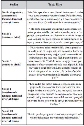 Al analizar el texto libre ingresado por los alumnos en la bitácora podemos destacar que los principales temas abordados en la sesión de diagnóstico fueron: la falta de destreza y precisión, la falta de costumbre con el microscopio y el instrumental, el fallo en la preparación de los vasos, y el fallo en la disección. Por otro lado, en la sesión final, las frases comúnmente encontradas fueron: gran progreso, adecuada disección, reducción del tiempo al realizar el ejercicio, y fallo en realizar nudos equidistantes.