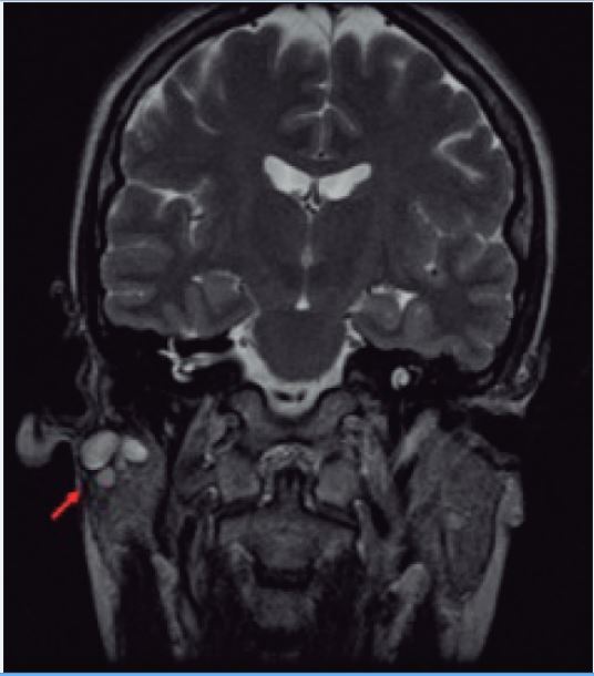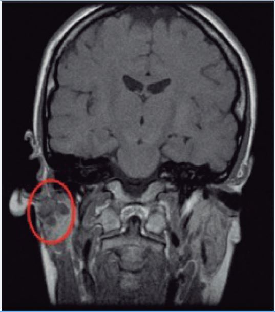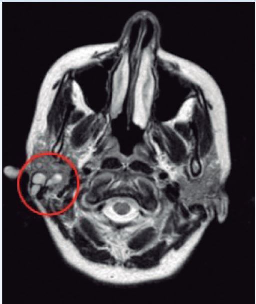 En general, se recomienda la ecografía como herramienta inicial de diagnóstico por imagen, que además ofrece la posibilidad de guiar la punción y aspiración por aguja fina (PAAF) o aguja gruesa (BAAG).( 9 ) Sin embargo, presenta como limitaciones el ser una técnica operador dependiente, la dificultad en la evaluación del lóbulo profundo de la parótida, del espacio parafaríngeo y de los tumores pedunculados de la parótida, y la no disposición de imágenes permanentes. Debido a todo esto, consideramos que la ecografía no es útil para el planteamiento quirúrgico en una lesión del tipo de la que presentaba nuestra paciente, por lo que recomendamos practicar mejor una RMN,( 10 ) tal y como hemos descrito en la presentación de nuestro caso clínico.