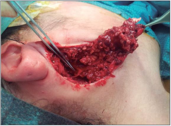 El crecimiento de la lesión es intraparotídeo en la porción posterior de la glándula, llamada cola de la parótida, con delimitación clara entre ambas estructuras. La lesión crecía dentro de la glándula en profundidad y hacia la piel, dando la presentación clínica.