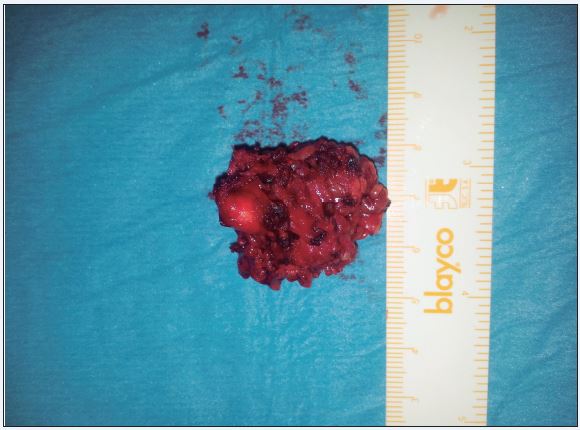 Dado que en la primera atención en urgencias solo se había practicado drenaje, sin retirada de la cápsula, se planificó extirpación quirúrgica completa bajo anestesia local. A pesar de ello, en el protocolo de intervención quirúrgica se describe la imposibilidad de llevar a cabo una extirpación completa de la lesión, dejando la porción más profunda de la misma. El diagnóstico anatomopatológico de la tumoración extirpada fue de quiste epidérmico