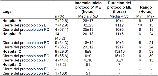 Por otro lado, la media de cierre del protocolo con examen complementario de los cuatro hospitales fue de 12 ± 8 horas y de cierre con prueba clínica de 10 ± 6 horas.
