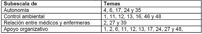 Con el fin de atender el primer objetivo, se utilizó el NursingWork Index (NWI) versión traducida y validada para el contexto brasileño (B-NWIR) 14. El instrumento tiene como objetivo principal medir la presencia de características del ambiente de trabajo que favorecen la práctica profesional de enfermería. Este cuestionario está compuesto por 57 ítems, estando 25 divididos en las subescalas autonomía, control sobre el ambiente, relación entre médicos y enfermeros y soporte organizacional 15.